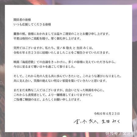 太平洋在线彩票网皇冠现金投注网网址太平洋在线近日,日本演艺圈迎来了一则喜信。26岁的日本女星生田将来(生田みく)于4月23日细致文告成亲,其丈夫是盛名电影导演堂之本敬太。两东谈主因2021年迷惑电影《海底悲歌》而结缘,三年的甘好意思来回终于着花恶果皇冠手机网址,步入了婚配的殿堂。